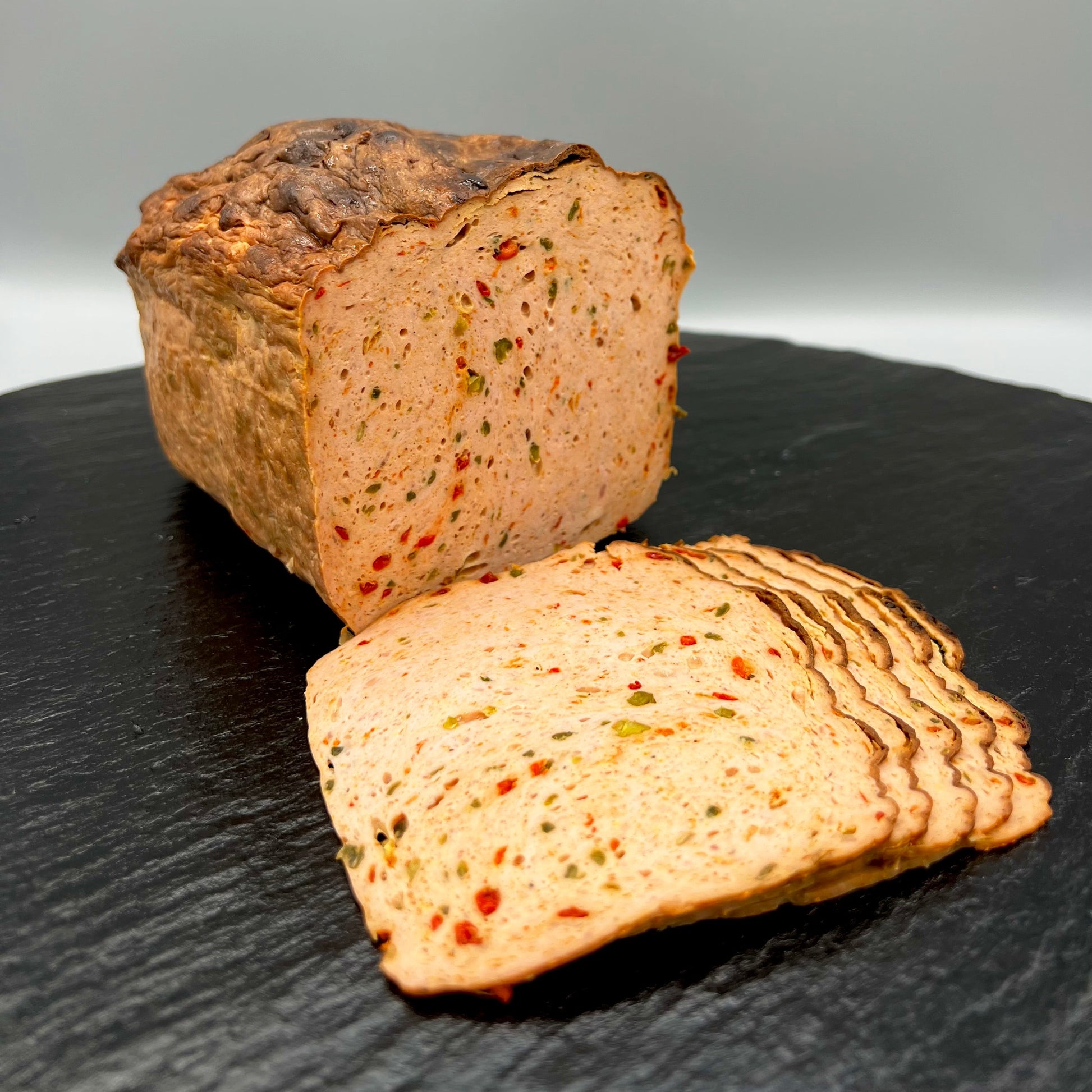 Saftiger Leberkäs nach traditionellem Hausrezept mit feurigen Chilis.