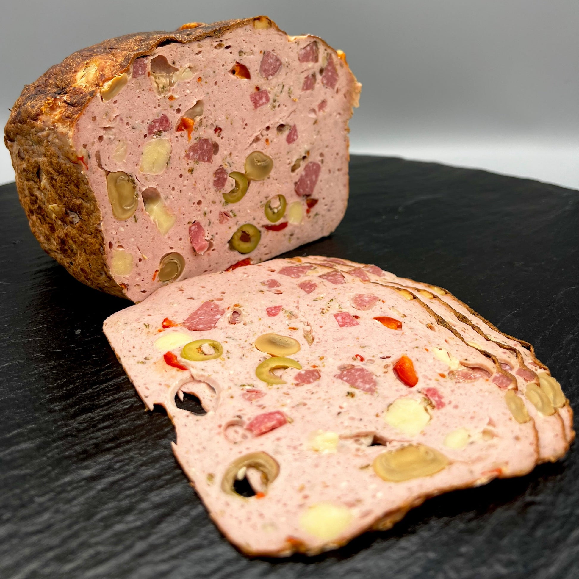 Leberkäs mit deftiger Käse-, Salami-, Paprika- und Pilzeinlage.