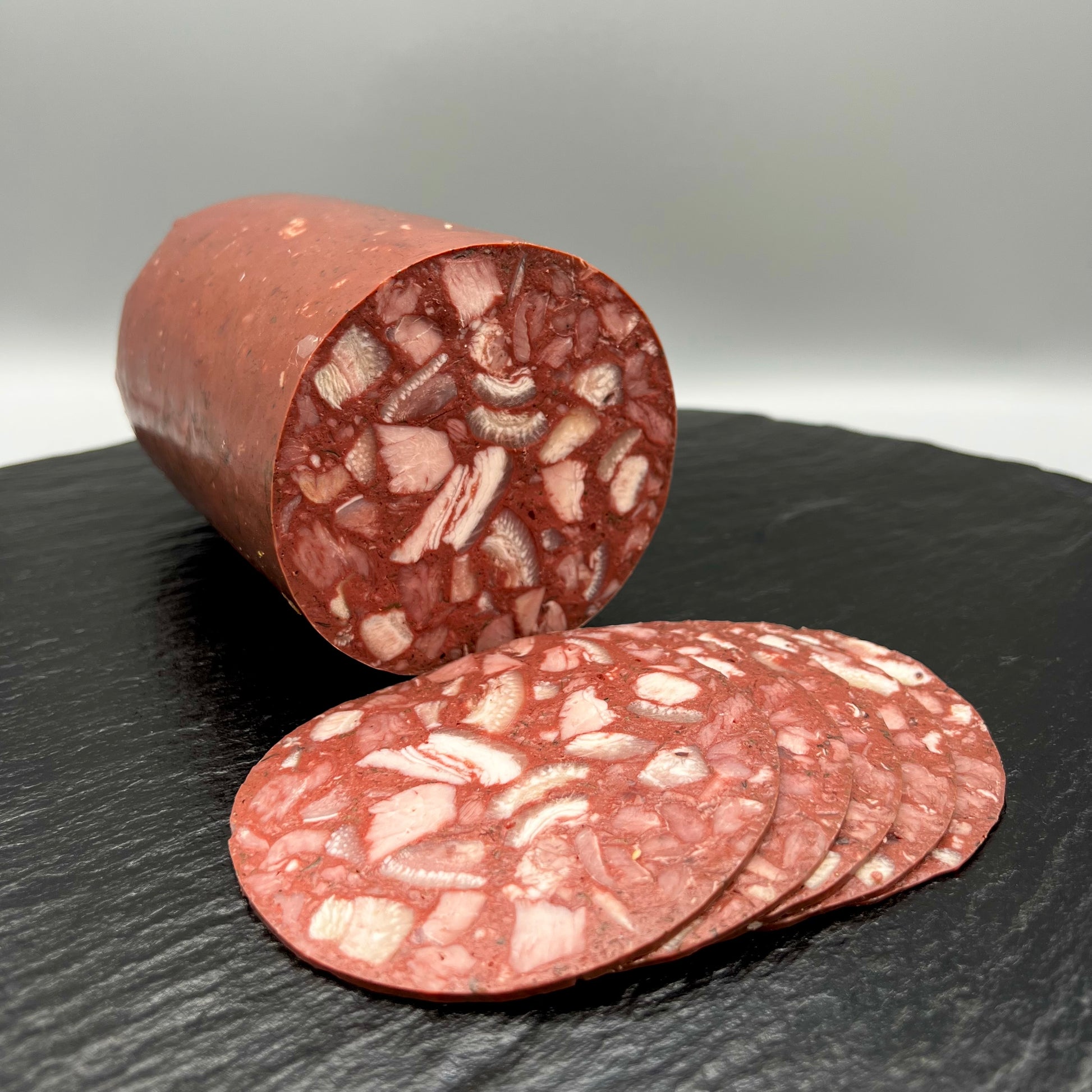 70 % Schweinefleisch, 15 % Trinkwasser, 10 % Schwarte, Schweineblut,